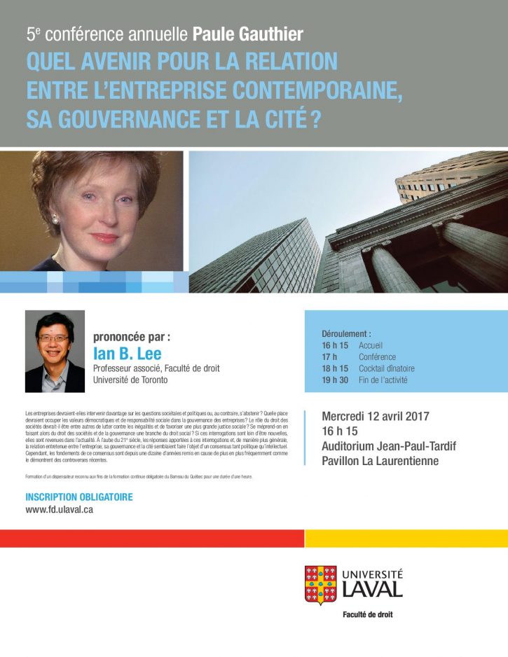 La 5e conférence annuelle Paule-Gauthier, tenue le 12 avril 2017, a été une soirée bien remplie et appréciée des convives: la présentation du professeur Ian B. Lee de la Faculté de droit de l’Université de Toronto au sujet de la relation entre l’entreprise contemporaine, sa gouvernance et la cité, la remise de la bourse d’excellence Paule-Gauthier – […] Lire la suite