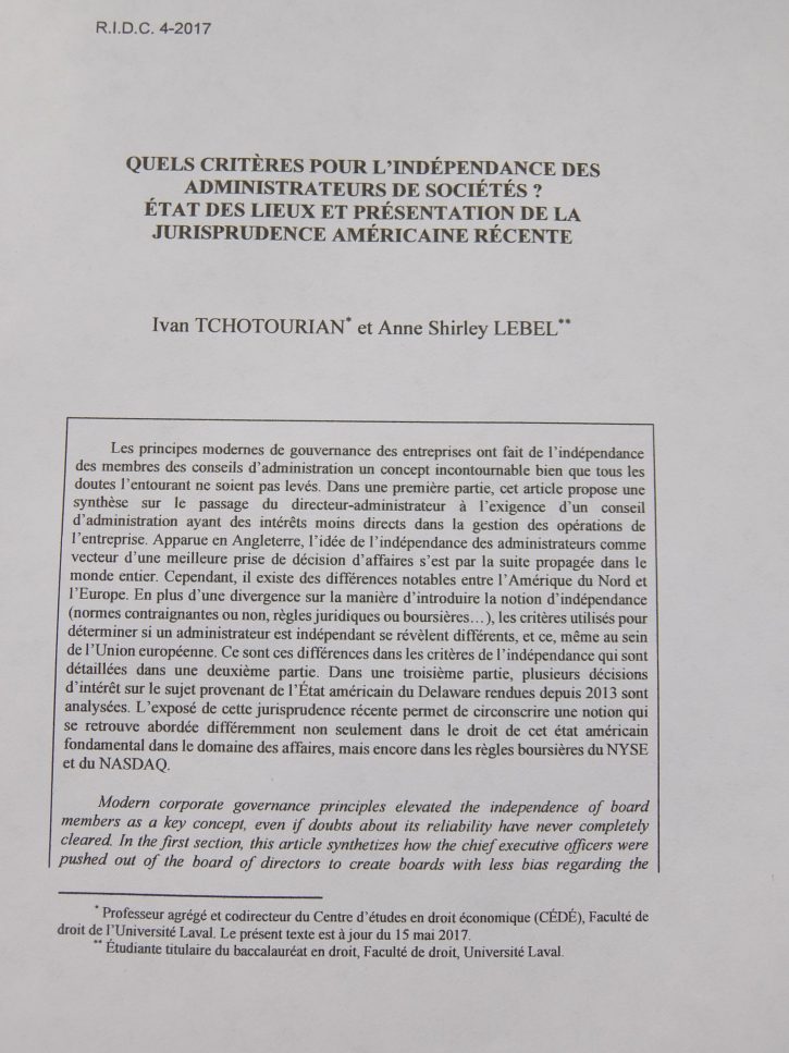 Une belle aventure avec Anne Shirley LeBel ! Notre papier traitant de l’indépendance des administrateurs va être publié par la Revue internationale de droit comparé (RIDC, 4-2017) : « Quels critères pour l’indépendance des administrateurs de sociétés ? État des lieux et présentation de la jurisprudence américaine récente ». Les principes modernes de gouvernance des entreprises ont fait de l’indépendance […] Lire la suite