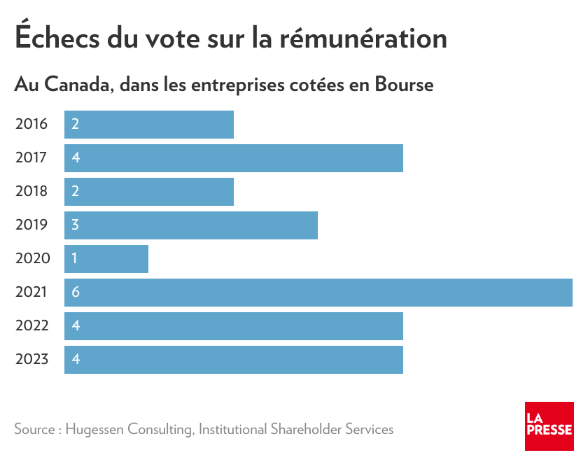 Un dossier de La presse du 16 septembre 2024 dirigé par Julien Arsenault intitulé « Rémunérations controversées : quand les actionnaires font plier les patrons » intéressera nos lectrices et lecteurs. Preuve que le droit de vote des actionnaires fonctionnaires et peut contraindre le CA et la direction à refaire leurs devoirs ! Je vous reproduit également l’image de l’article qui montre que l’échec du vote n’est pas qu’une hypothèse d’école…