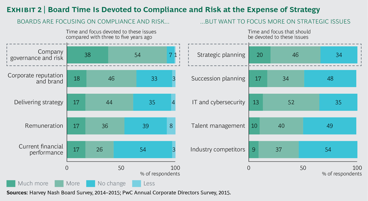 bcg.perspectives publie un excellent article qui insiste sur le déséquilibre de l’investissement des membres du CA : conformité et risques sont priorisés au détriment de la stratégie (« Looking for Smoke Under the Door: The Case for an Actively Engaged Board »).