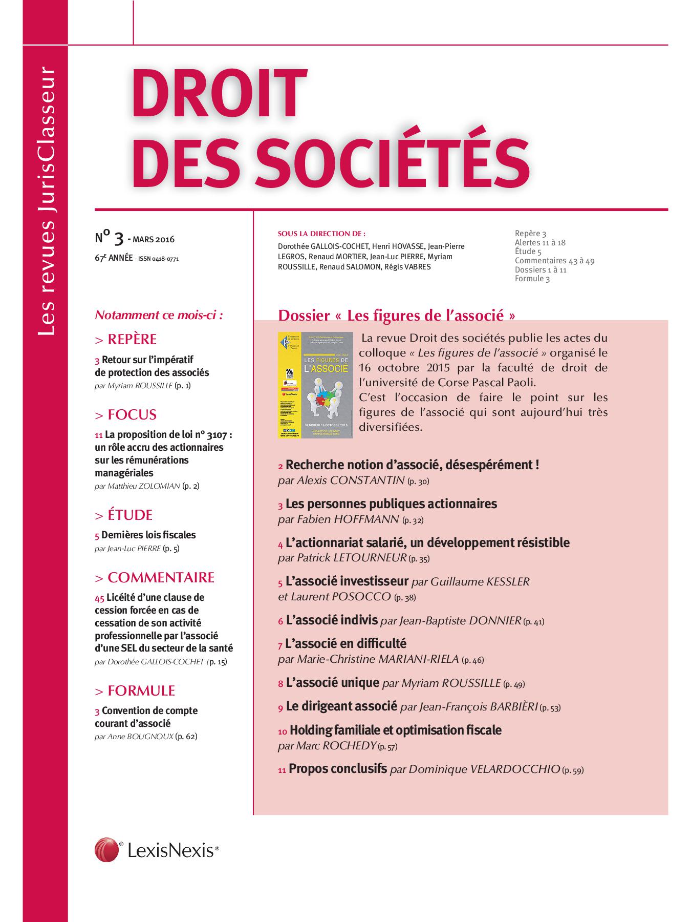 La revue Droit des sociétés (no 3, mars 2016) a publié les actes du colloque « Les figures de l’associé » organisé le 16 octobre 2015 par la faculté de droit de l’université de Corse Pascal Paoli. Ce numéro est l’occasion de faire le point sur les figures de l’associé qui sont aujourd’hui très diversifiées.