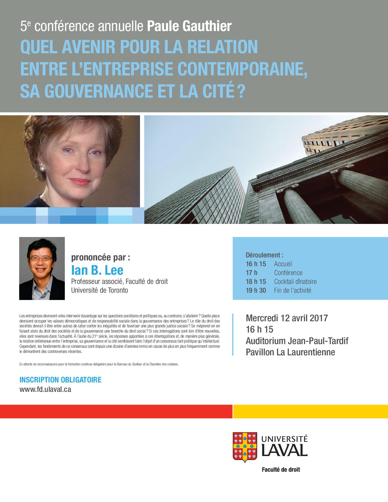 À l’occasion de sa 5e édition, la conférence annuelle Paule Gauthier accueillera le professeur Ian B. Lee de la Faculté de droit de l’Université de Toronto. La conférence sera prononcée le mercredi 12 avril 2017, à l’Auditorium Jean-Paul-Tardif du pavillon La Laurentienne.