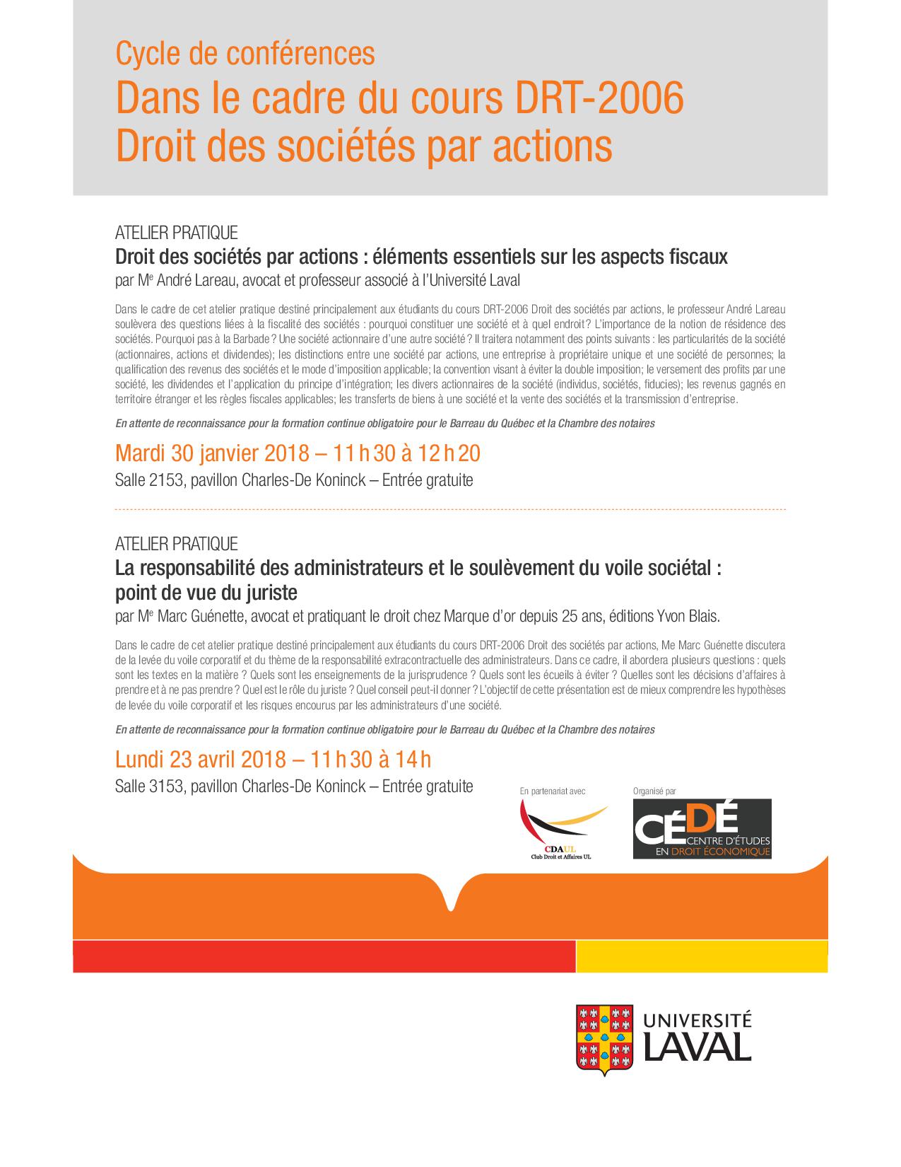 Dans le cadre de cet atelier pratique que j’organise dans le cadre de mon cours DRT-2006 Droit des sociétés par actions, le professeur André Lareau soulèvera des questions liées à la fiscalité des sociétés: pourquoi constituer une société et à quel endroit? L’importance de la notion de résidence des sociétés. Pourquoi pas à la Barbade? Une société actionnaire d’une autre société? Il traitera notamment des points suivants: