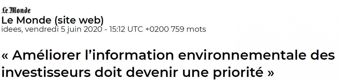 Voici une belle tribune au journal Le Monde de deux professeurs en faveur d’un reporting environnemental à la hauteur. Cet article permet aussi de mieux comprendre les enjeux qui se cachent derrière le reporting extrafinancier, sujet à l’apparence aride et technique ! Bien au contraire, on peut facilement y apercevoir des enjeux de sociétés, qui méritent débats et réflexions. À très vite pour un nouveau billet.